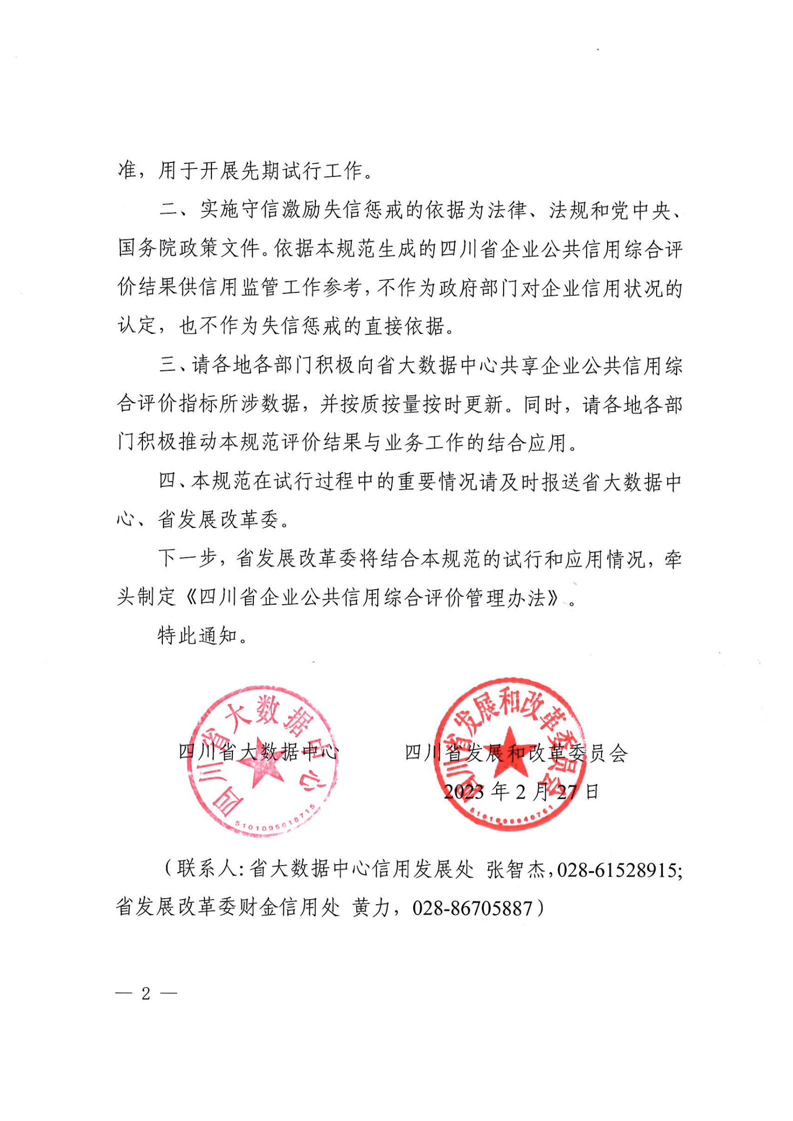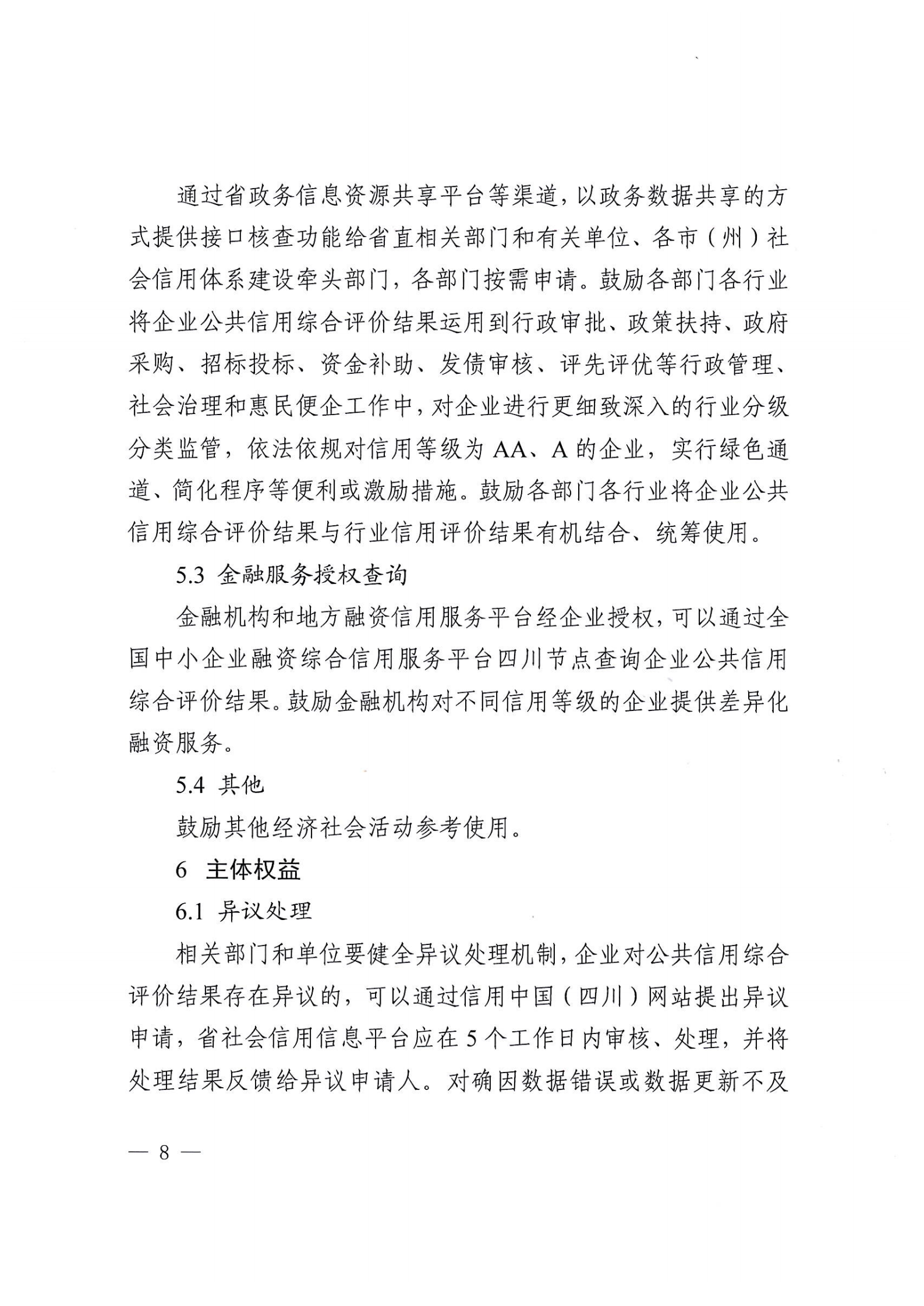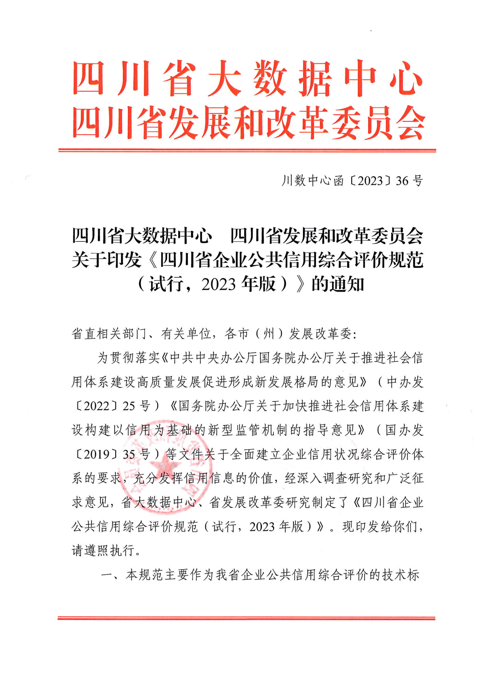 為貫徹落實《中共中央辦公廳國務(wù)院辦公廳關(guān)于推進社會信用體系建設(shè)高質(zhì)量發(fā)展促進形成新發(fā)展格局的意見》(中辦發(fā)〔2022〕25號)《國務(wù)院辦公廳關(guān)于加快推進社會信用體系建設(shè)構(gòu)建以信用為基礎(chǔ)的新型監(jiān)管機制的指導意見》(國辦發(fā)〔2019〕35號)等文件關(guān)于全面建立企業(yè)信用狀況綜合評價體系的要求,充分發(fā)揮信用信息的價值,經(jīng)深入調(diào)查研究和廣泛征求意見,省大數(shù)據(jù)中心、省發(fā)展改革委研究制定了《四川省企業(yè)公共信用綜合評價規(guī)范(試行,2023年版)》?,F(xiàn)印發(fā)給你們,請遵照執(zhí)行。